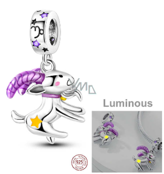 Charm Sterlingové stříbro 925 Znamení zvěrokruhu Kozoroh, zářící ve tmě luminozní přívěsek na náramek