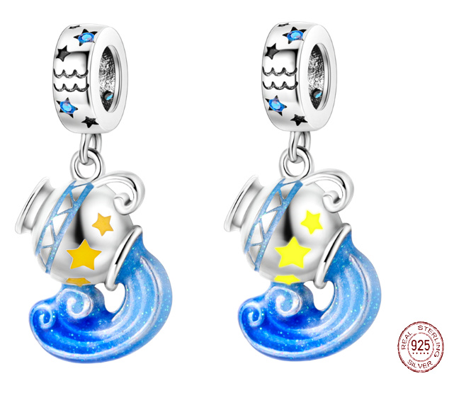 Září ve tmě, přívěsek zvěrokruhu se symbolem vodníka Vodnáře, navržená s odstíny hladkého modrého a žlutého smaltu a třpytivými modrými drahokamy Zirkonu. Na prstenu kouzla jsou kolem dokola malé Hvězdy a na něm vyrytý astrologický symbol Vodnáře.