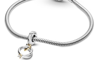 Tento stříbrný přívěsek obsahuje srdce ze zlata spojené se dvěma propletenými prsteny, jeden stříbrný prsten se třpytivým kamenem zasazeným ve zlatu a jeden kroužek ze stříbra. Na obou je uvnitř vyrytý text „You and I“ Ty a já a „Forever and always“ navždy a navždy. Na očku jsou dvě vyvýšená srdce. Neexistuje lepší způsob, jak symboly vyjádřit vaši lásku a závazek.