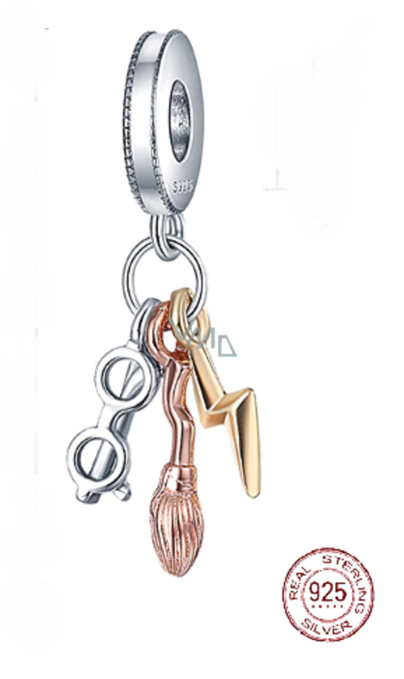 Charm Sterlingové stříbro 925 Harry Potter - Brýle, Nimbus 2000 a blesk, 3v1 přívěsek na náramek, film