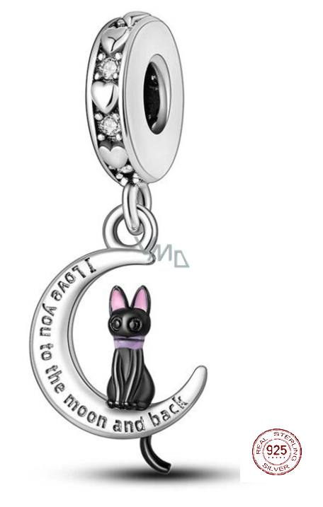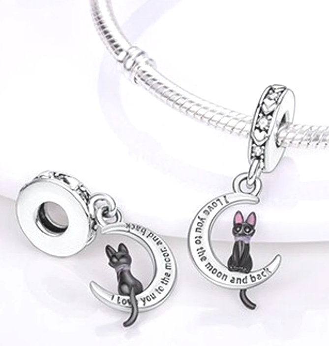 „Miluji tě na měsíc a zpět“ .. Visací přívěsek s malou černou kočkou na půlměsíci, navržený s hladkým černým a růžovým smaltem. Na straně měsíce jsou vyryta slova „Miluji tě na měsíc a zpět“. Prsten obsahuje malá srdíčka a kolem dokola bílé třpytivé drahokamy Zirkonu.
