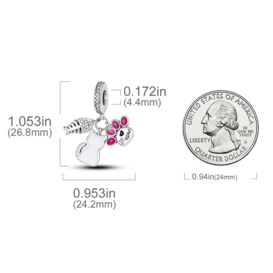 S tímto přívěskem budete mít svého čtyřnohého přítele vždy s sebou. Přívěsek se skládá ze 3 částí, třpytivé kočky, potisku tlapky kočky a Rybí kosti jako kočičí hračka. Potisk tlapky je zdobený textem „Mrow“ v černém smaltu s malým srdíčkem a polštářky nohou jsou smaltované růžové . Kočka má bílý třpyt. Rybí kost má nahoře 6 průhledných zirkonů. Samotné kouzlo je také obklopeno průhlednými Zirkony. Toto kouzlo dělá náramek hravým a osobním. Kouzlo můžete nosit jako poctu svému mazlíčkovi. Vhodné i jako dárek pro milovníka koček.