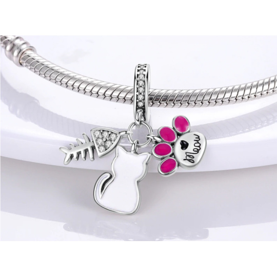 Charm Sterlingové stříbro 925 Kočka, tlapka, ryba - meow, 3v1 přívěsek na náramek mazlíček