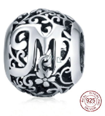 Charm Sterlingové stříbro 925 Kouzelná abeceda písmeno M s květinami, korálek na náramek