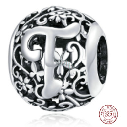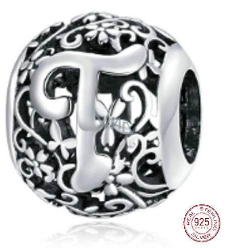 Charm Sterlingové stříbro 925 Kouzelná abeceda písmeno T s květinami, korálek na náramek