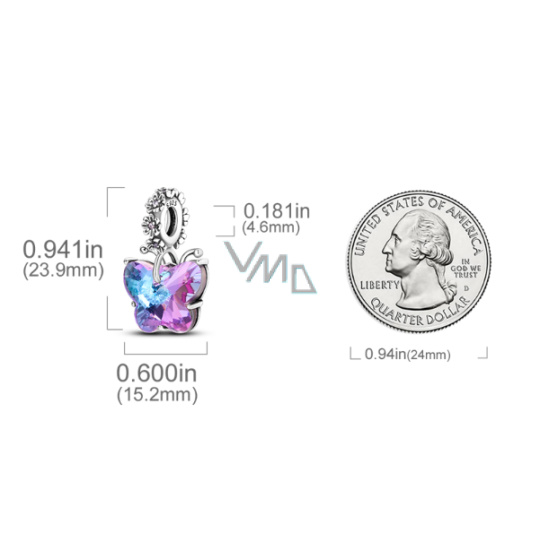 Stříbrný visací přívěsek s fialovým a modrým motýlem, navržený s velkým třpytivým drahokamem Zirkonem. Prsten má kolem dokola drobné kvítky zdobené fialovými zirkonovými drahokamy. Originální design přívěsku, kvalitní zpracování, ručně dohotovené.