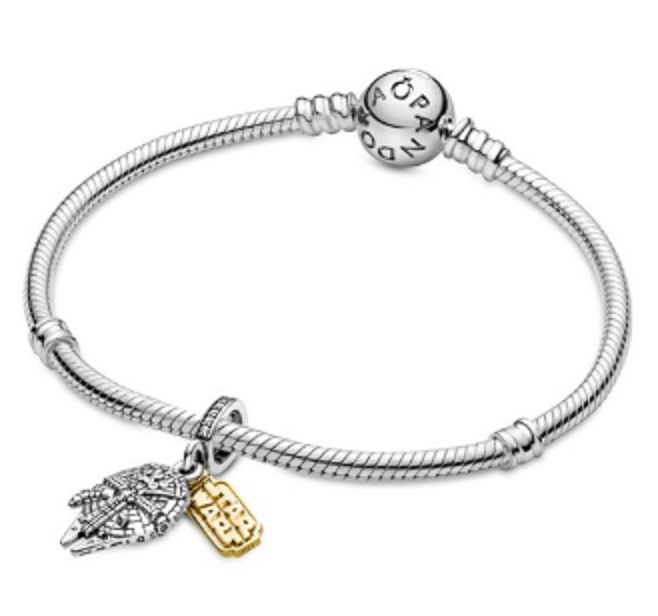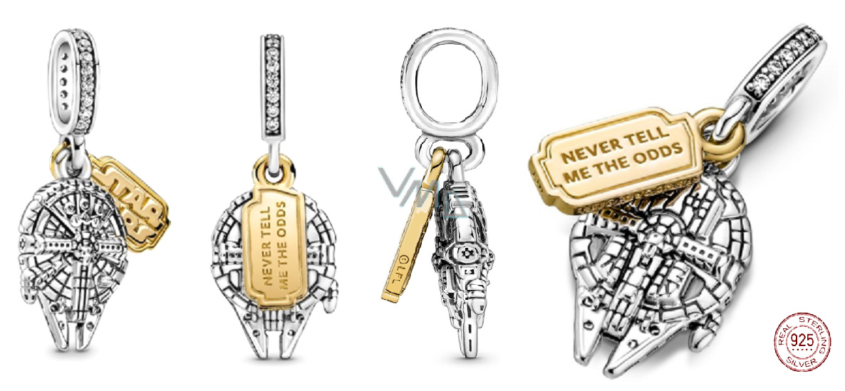 Přívěsek, vyrobený ze sterlingového stříbra jeden přívěsek s designem ikonické vesmírné lodě Millennium Falcon, druhý přívěsek s logem filmu Star Wars a gravírováním „Never tell me the odds“ Nikdy mi neříkej šance, nechybí třpytivé osazení čirými kamínky kubické zirkonie, navléká se na náramky.