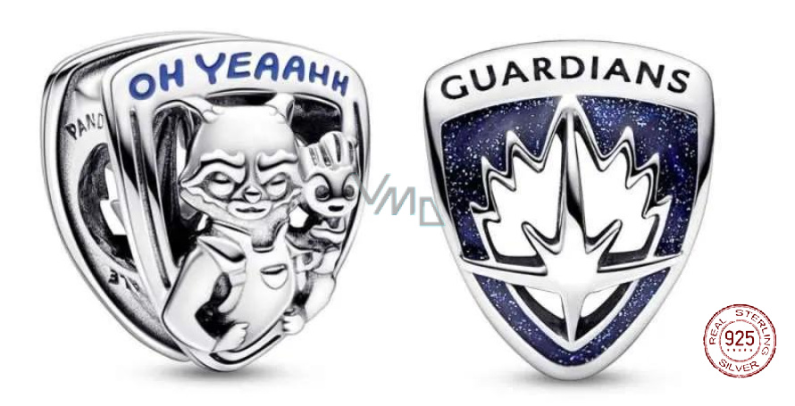 Charm Sterlingové stříbro 925 Marvel Strážci Galaxie, Rocket Raccoon a Grootův emblém, korálek na náramek, film