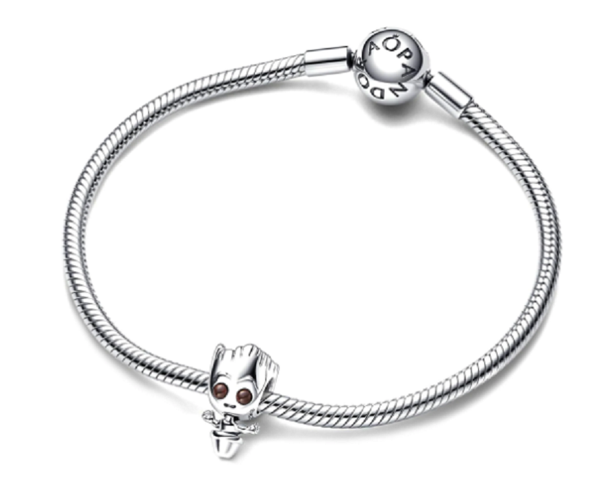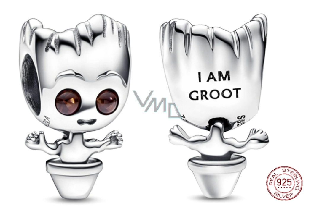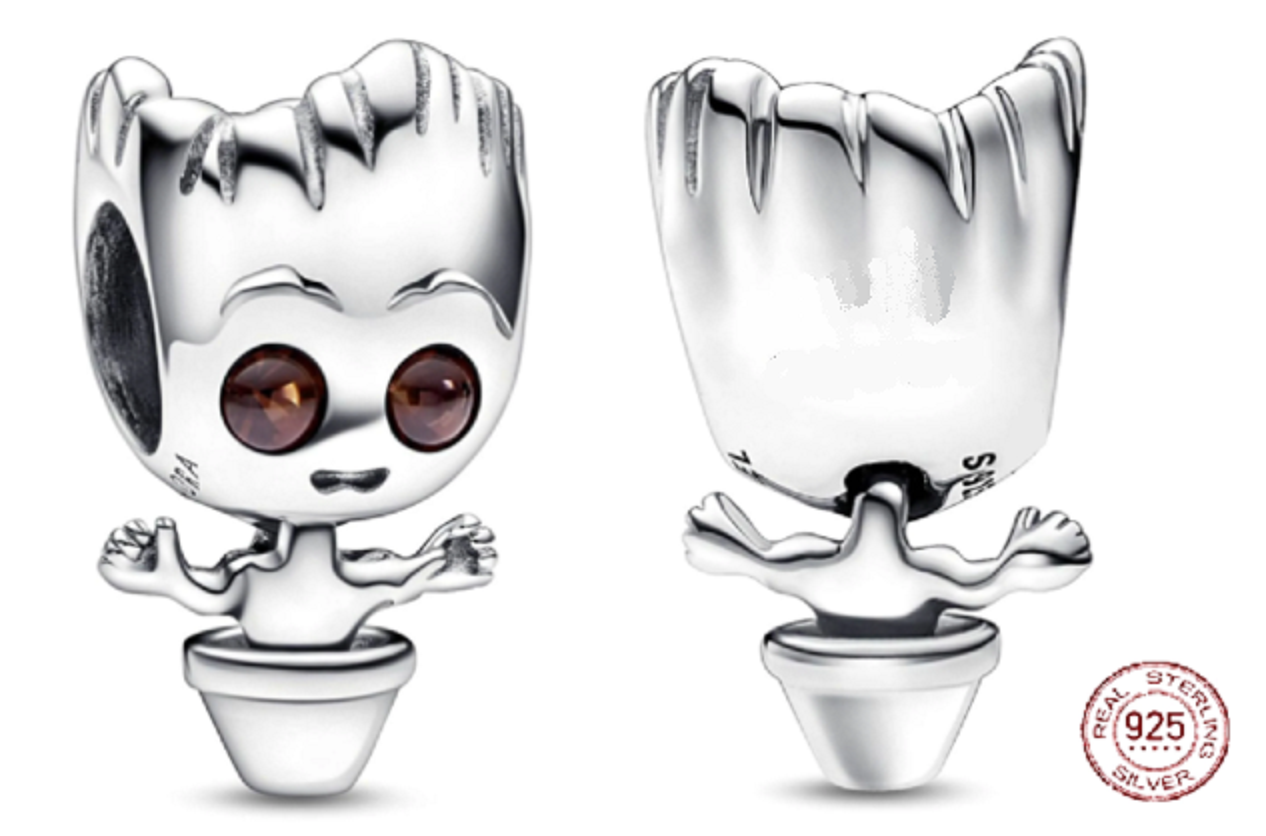 "Groot, který se v květináči pohupuje ze strany na stranu, je vyroben ze sterlingového stříbra s hnědými umělými krystaly zasazenými jako oči a vroubkovanými detaily připomínajícími kůru jako vlasy a obočí. Přidejte si tento přívěsek do své sbírky jako symbol své schopnosti sílit každým dnem.