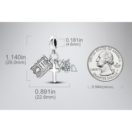 Trojitý přívěsek se svatou Biblí, křížem a andělem, navržený s bílými třpytivými Zirkony. Na zadní straně kouzla Holy Bible jsou vyryta slova „u Boha je všechno možné“.