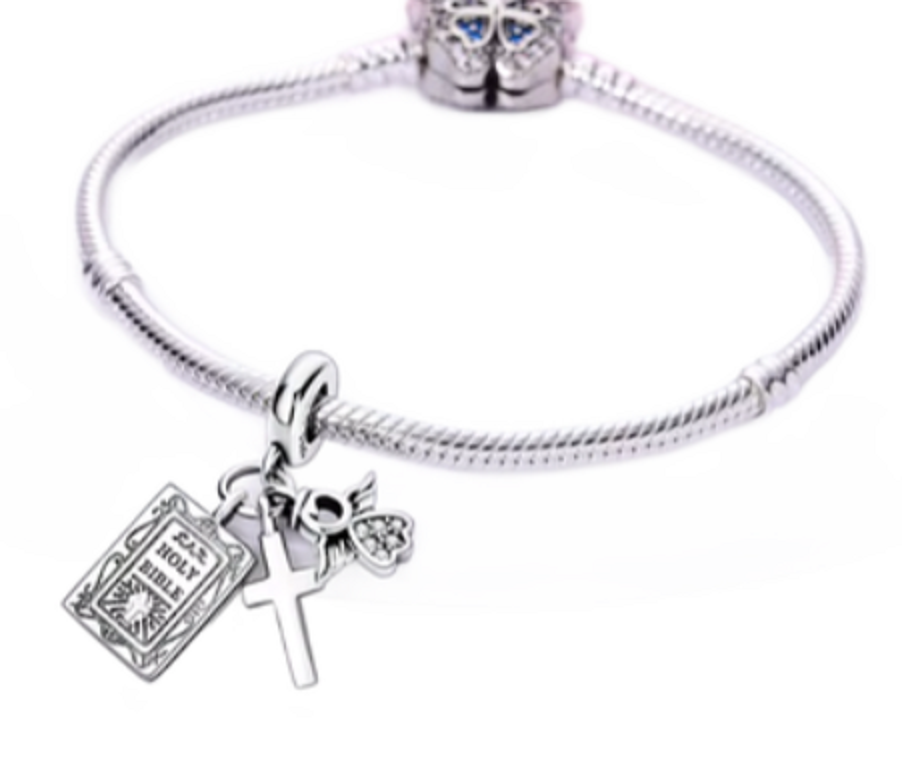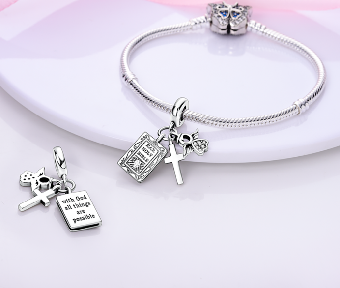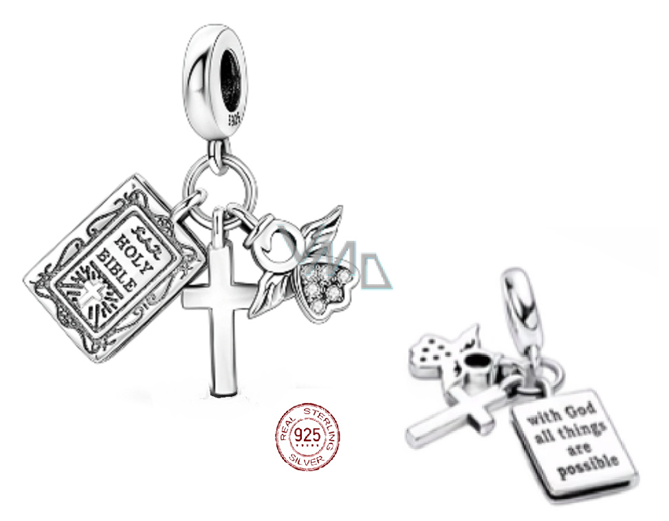 Charm Sterlingové stříbro 925 Náboženská kouzla, První přijímání, křest - Bible s bohem jsou všechny věci možné, 3v1 přívěsek na náramek