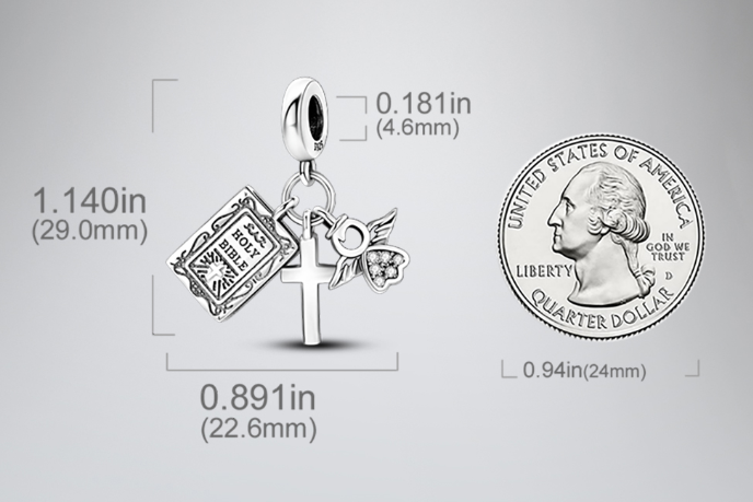 Trojitý přívěsek se svatou Biblí, křížem a andělem, navržený s bílými třpytivými Zirkony. Na zadní straně kouzla Holy Bible jsou vyryta slova „u Boha je všechno možné“.