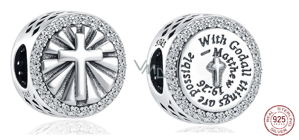 Elegantní korálek s malým křížkem a duchovním biblickým citátem: "U Boha je všechno možné - Matthew - Matouš 19:26" (U Boha = ve víře je všechno možné - Matouš 19:26). Šperk je velmi detailně navržený, kolem dokola prořezávané a malé vyražené kousky Herzen. Krásný symbol lásky a silné důvěry v božskou kreativitu.