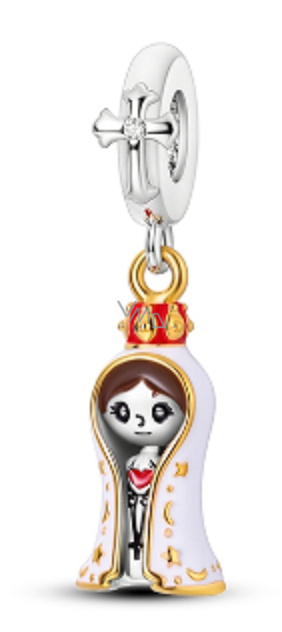 Visací přívěsek s Pannou Marií, navržený s hladkým bílým, červeným a zlatým smaltem. Na prstenu přívěsku je kříž zdobený bílým třpytivým Zirkonem.