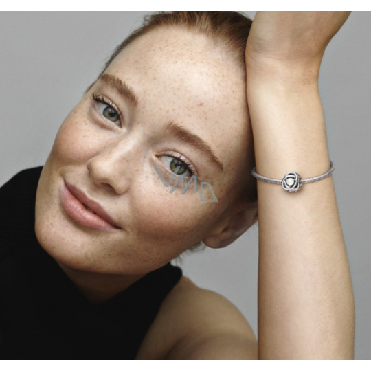 Stříbrný korálek s motivem věčnosti. Dodejte svým náramkům a přívěskům šmrnc pomocí tohoto věčného kruhu. Tento speciální kousek je vyroben ve tvaru nekonečného copu a ve svém středu je osazen bílým Perleťovým krystalem. Symbolizující věčnost, přidejte toto jiskřivé kouzlo do svého stylu, aby vaše každodenní šperky získaly jasnou aktualizaci.