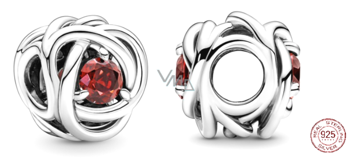 Stříbrný korálek s motivem věčnosti. Dodejte svým náramkům a přívěskům šmrnc pomocí tohoto věčného kruhu. Tento speciální kousek je vyroben ve tvaru nekonečného copu a ve svém středu je osazen červeným krystalem. Symbolizující věčnost, přidejte toto jiskřivé kouzlo do svého stylu, aby vaše každodenní šperky získaly jasnou aktualizaci.