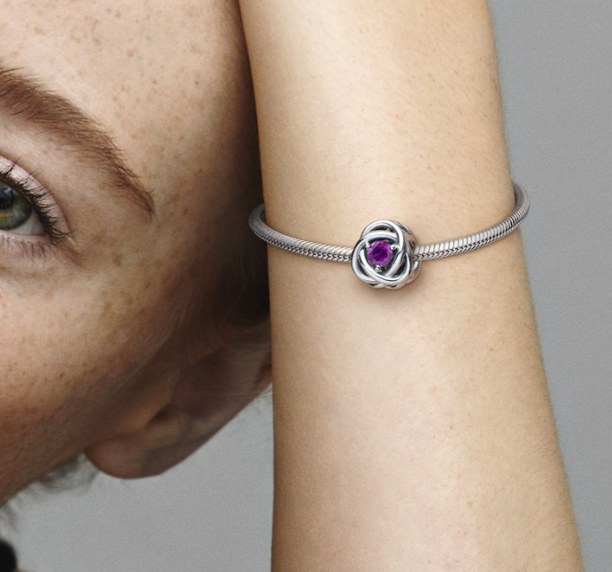 Stříbrný korálek s motivem věčnosti. Dodejte svým náramkům a přívěskům šmrnc pomocí tohoto věčného kruhu. Tento speciální kousek je vyroben ve tvaru nekonečného copu a ve svém středu je osazen tmavě purpurovým krystalem. Symbolizující věčnost, přidejte toto jiskřivé kouzlo do svého stylu, aby vaše každodenní šperky získaly jasnou aktualizaci.