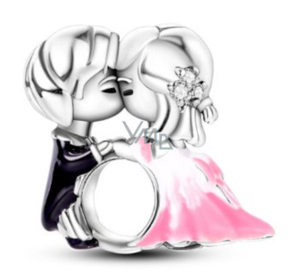 Přívěsek ze stříbra 925 s líbající se nevěstou a žeNichem, navržený s růžovým a černým smaltem a bílými třpytivými Zirkony.