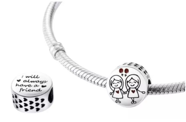 Přívěsek vyrobený ze stříbra, zdobený srdíčky a dvěma sestra držící se za ruce, najdete na něm nápis "I will always have a friend" (Vždy budu mít kamarádku". Roztomilý přívěsek rozveselí váš náramek. Ať už si chcete připomenout zvláštní okamžik nebo jednoduše dodat svému náramku jiskru, toto kouzlo ze sterlingového stříbra určitě udělá dojem. Přidejte si ji tedy do své sbírky ještě dnes a užívejte si její nadčasovou krásu v nadcházejících letech!