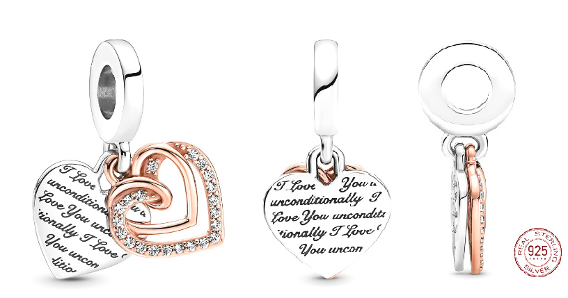 Charm Sterlingové stříbro 925 Rose Bezpodmínečná láska - propletené srdce, 2v1 přívěsek na náramek láska