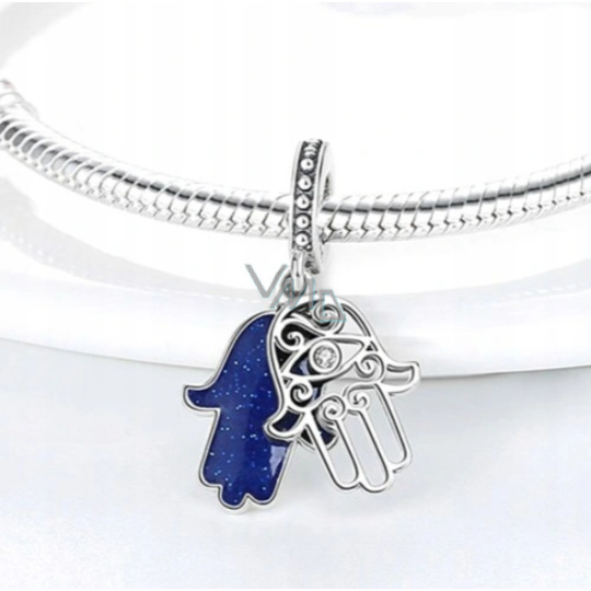 Visací přívěsek ze stříbra 925 s prolamovaným designem s Fatiminou hlídací rukou, nošený pro ochranu a štěstí. Dekorováno hladkým modrým smaltem a třpytivým bílým drahokamem Zirkonu. S každým přívěskem vyprávějte svůj příběh a vytvořte náramek, který odráží, kdo jste a co je pro vás důležité. Tvůj styl. Váš náramek. Tvůj příběh.