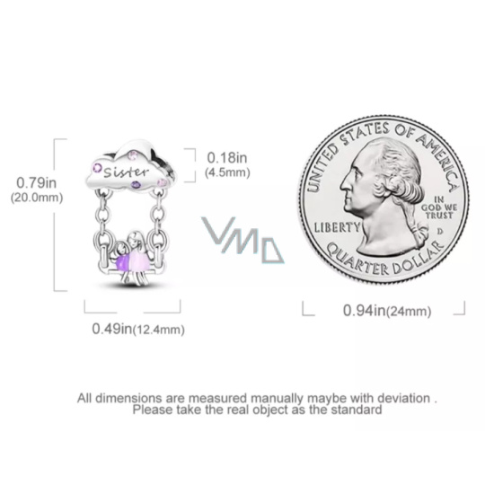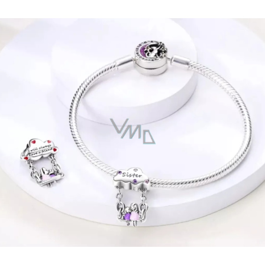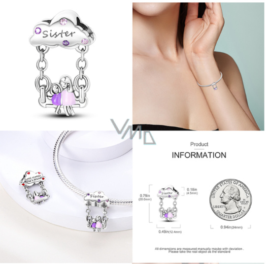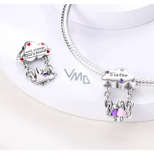 Visací přívěsek se dvěma dívkami houpajícími se z obláčku s vyrytým slovem „sestra“ na jedné straně a "I will always have a friend" což znamená "Budu vždy tvůj přítel" na straně druhé. Navrženo s hladkým růžovým, fialovým a červeným smaltem a jiskřivými růžovými a fialovými drahokamy Zirkonu. Tento stříbrný přívěsek je složitě propracovaný s jemnými detaily.