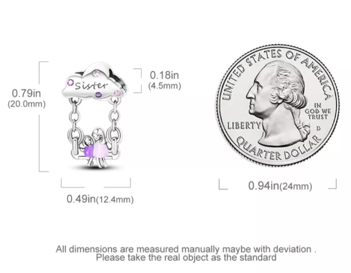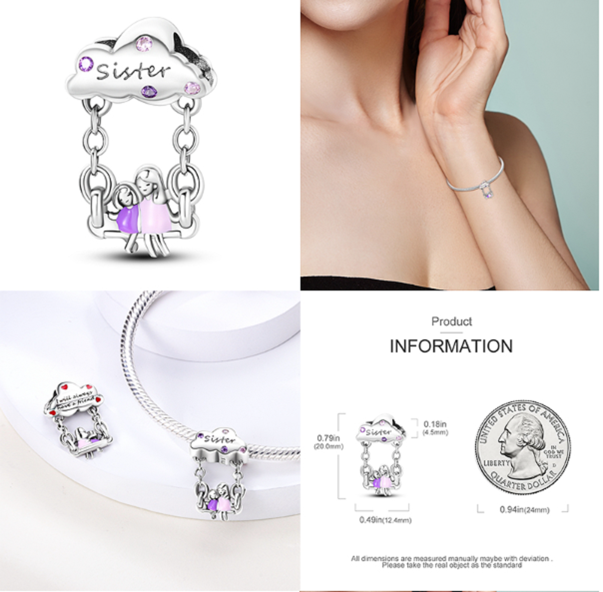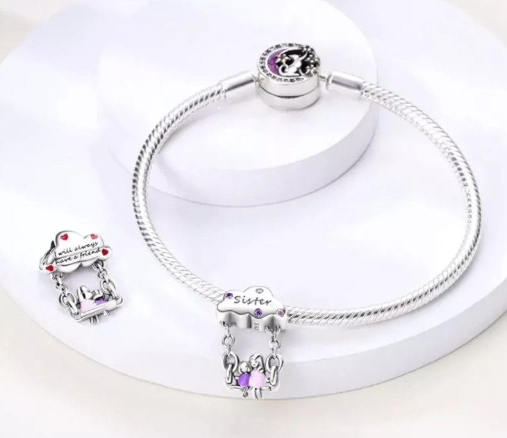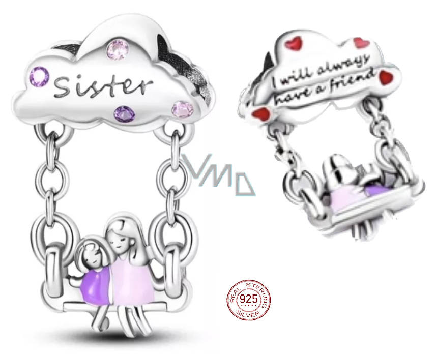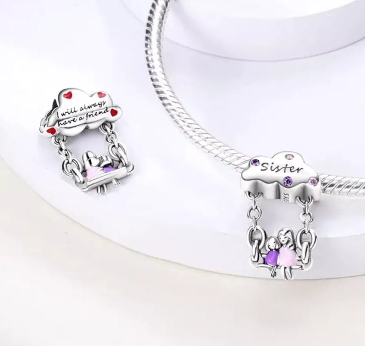 Visací přívěsek se dvěma dívkami houpajícími se z obláčku s vyrytým slovem „sestra“ na jedné straně a "I will always have a friend" což znamená "Budu vždy tvůj přítel" na straně druhé. Navrženo s hladkým růžovým, fialovým a červeným smaltem a jiskřivými růžovými a fialovými drahokamy Zirkonu. Tento stříbrný přívěsek je složitě propracovaný s jemnými detaily.