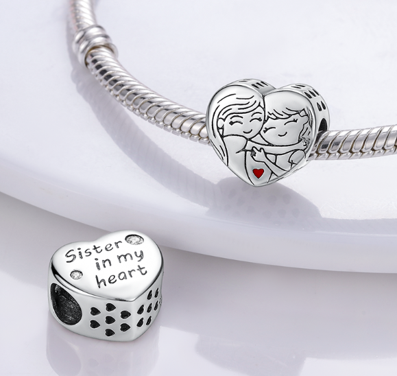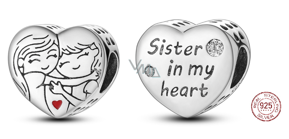 Přívěsek ve tvaru srdce se dvěma nejlepšími přáteli s malým červeným srdcem, navržený s hladkým červeným smaltem. Na zadní straně přívěsku je vyrytý nápis „sestra v mém srdci“ se dvěma bílými třpytivými drahokamy Zirkonu. Po stranách přívěsku jsou malá srdíčka s prolamovaným designem