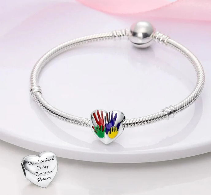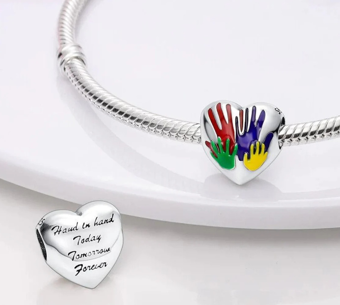 Přívěsek ve tvaru srdce se čtyřmi různými potisky rukou, navržený s hladkým barevným smaltem a slovy „Ruku v ruce, dnes, zítra, navždy“ vyrytým na zadní straně.