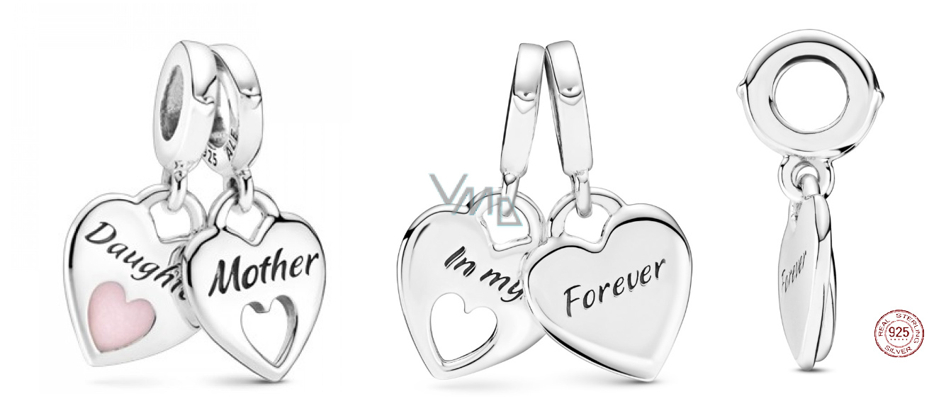 Charm Sterlingové stříbro 925 Srdíčkové přívěsky Matka a dcera - double heart, 2v1 přívěsek na náramek rodina