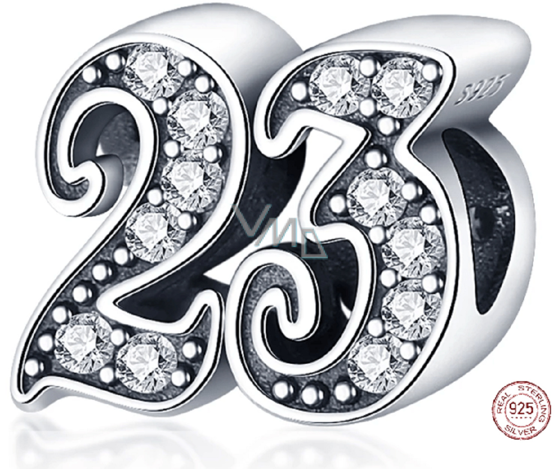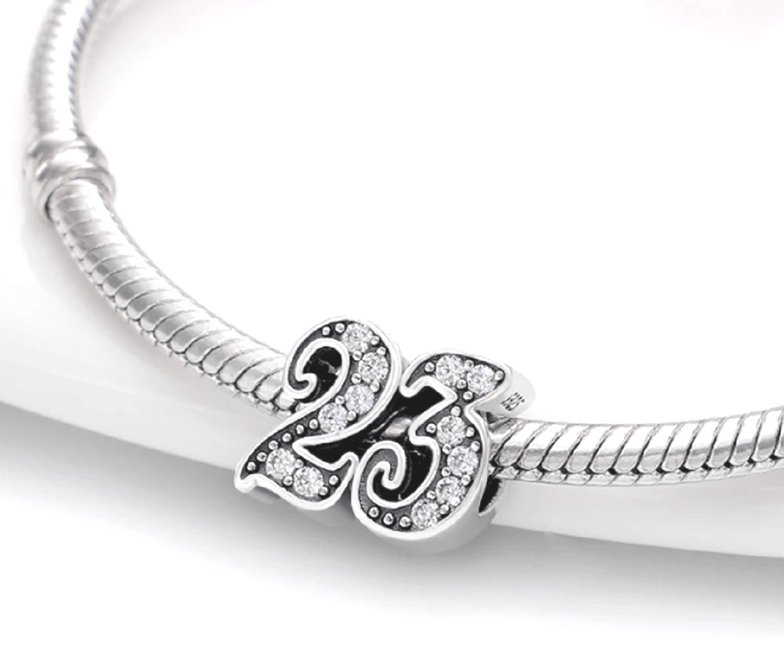 Tento přívěsek ze sterlingového stříbra pro náramky, vyrobený na oslavu 23. výročí nebo nezbedných 23 narozenin, je zvýrazněn kubickými Zirkony a korálkovými detaily.