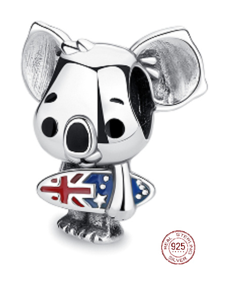 Charm Sterlingové stříbro 925 Surfující koala s australskou vlajkou, korálek na náramek cestování