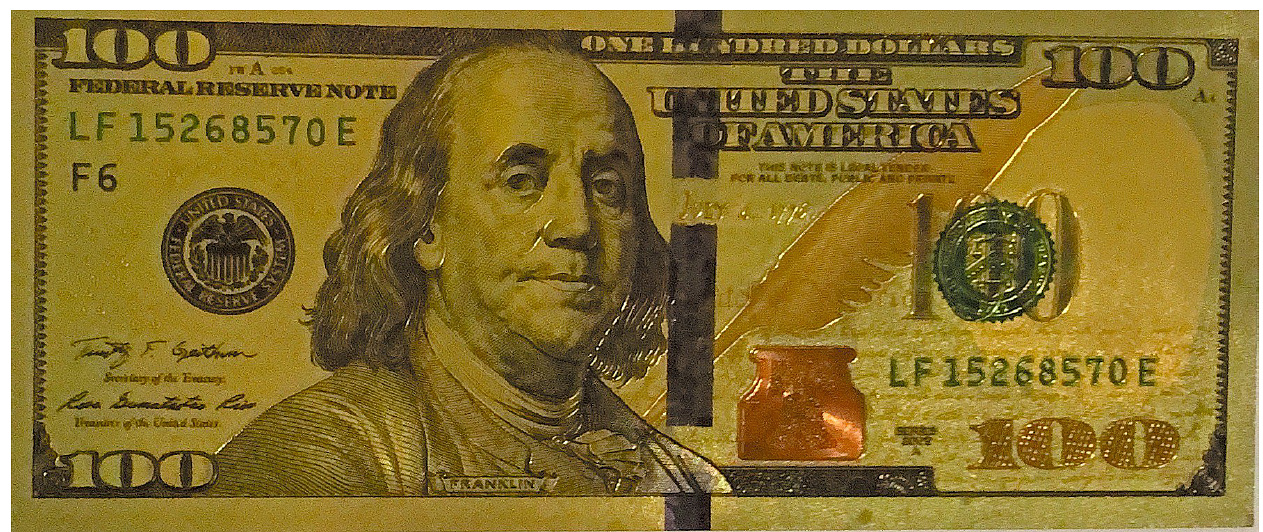 Zlatá 100-dolarovka pro cestovatele a lidi, co chtějí přilákat více peněz do své peněženky, bytu, kanceláře.