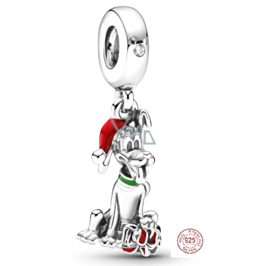 Přívěsek z kolekce Disneystříbrný 925 zobrazující Pluta, Disneyho postavičku, s obojkem natřeným ručně aplikovaným zeleným smaltem, vánoční čepicí natřenou ručně naneseným červeným smaltem.