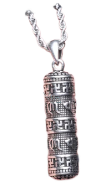 Tento ochranný amulet ve tvaru tibetského mantrového válce je stylovým doplňkem i duchovním talismanem. Reliéfní vzory a symboly na povrchu představují tradiční tibetskou mantru, která je považována za zdroj ochrany, klidu a Vnitřní síly.