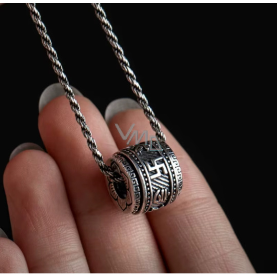 Elegantní přívěsek ve tvaru tibetského válečku je více než jen šperk – představuje ochranný amulet, který má přinášet štěstí, duchovní sílu a harmonii. Reliéfní zdobení vychází z tradičních tibetských symbolů, jež připomínají cestu k vnitřnímu klidu a ochraně před negativními vlivy.