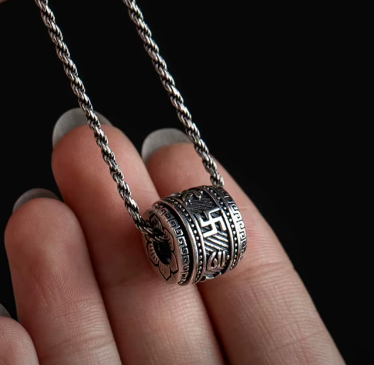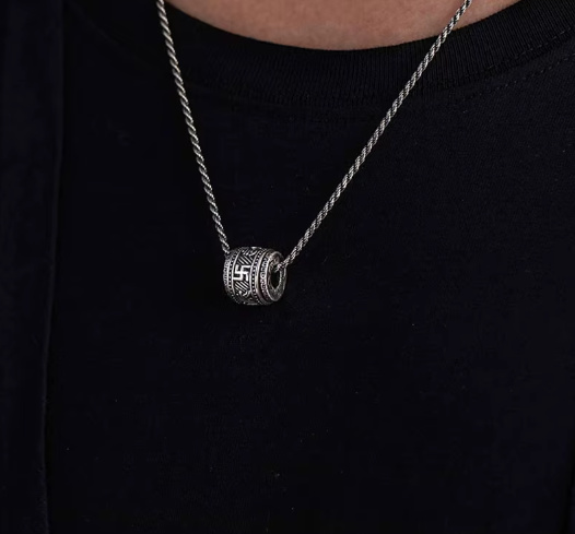 Elegantní přívěsek ve tvaru tibetského válečku je více než jen šperk – představuje ochranný amulet, který má přinášet štěstí, duchovní sílu a harmonii. Reliéfní zdobení vychází z tradičních tibetských symbolů, jež připomínají cestu k vnitřnímu klidu a ochraně před negativními vlivy.