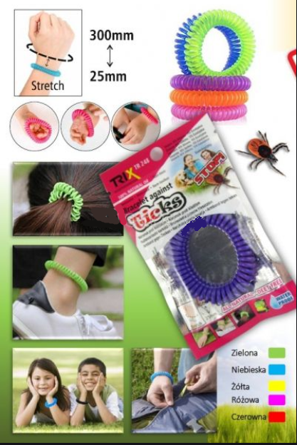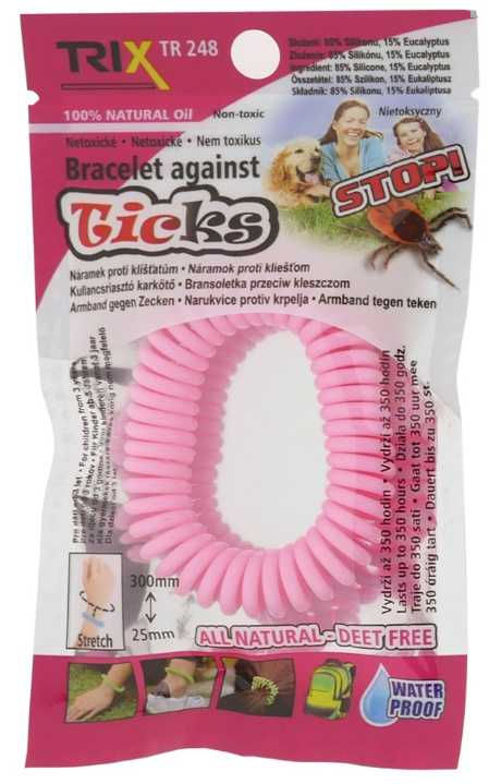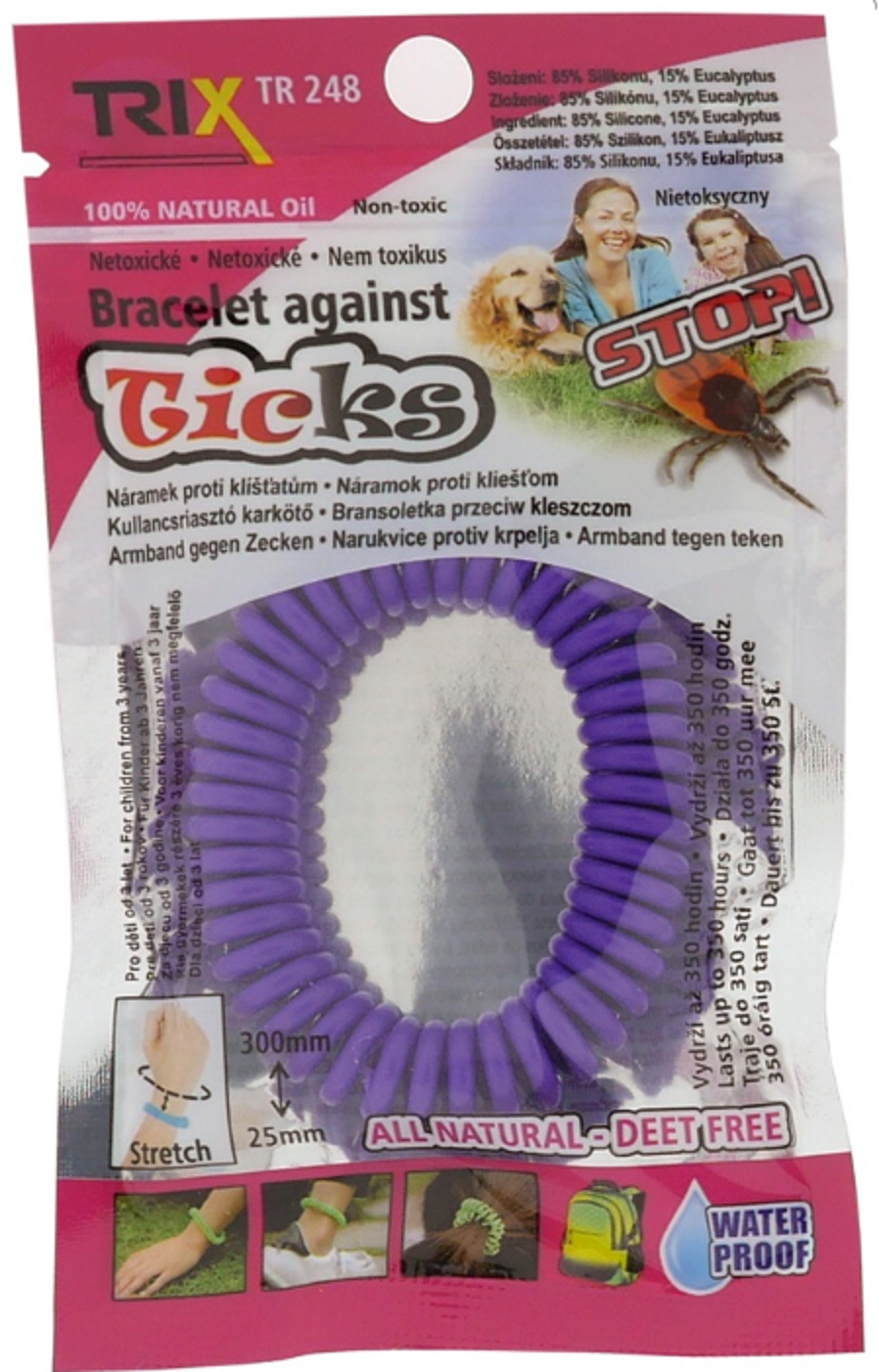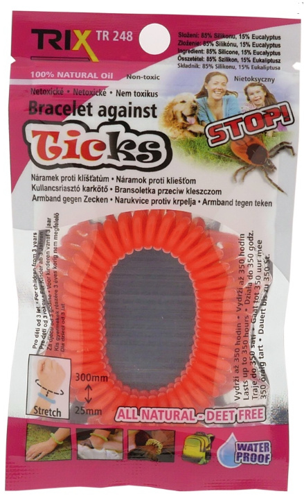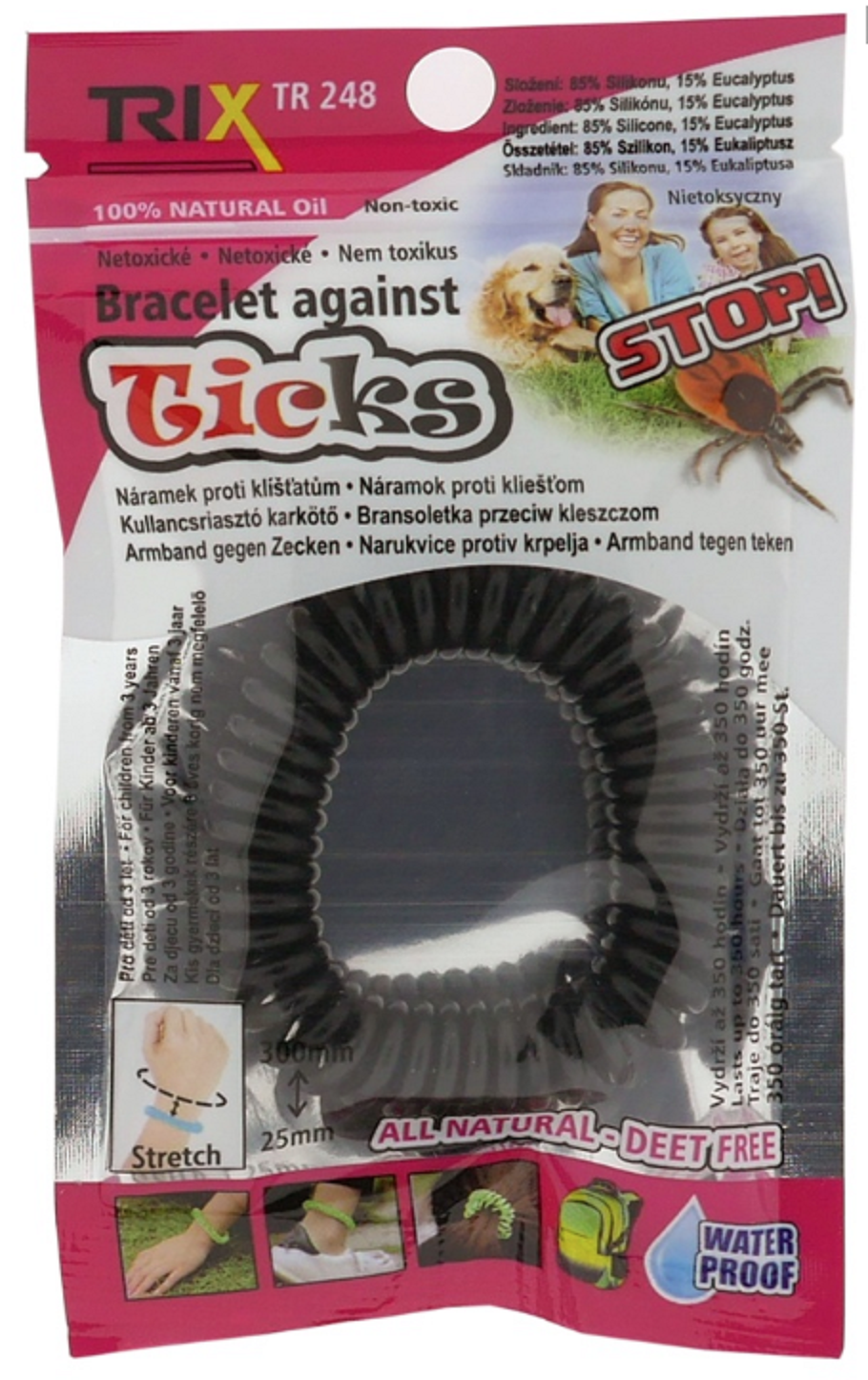 Pružný velmi kvalitní silikonový náramek odpuzující Klíšťata, napuštěný přírodním olejem z Eukalyptu, který je účinný v boji proti Klíšťatům. Díky použitému materiálu je náramek pružný a voděodolný.