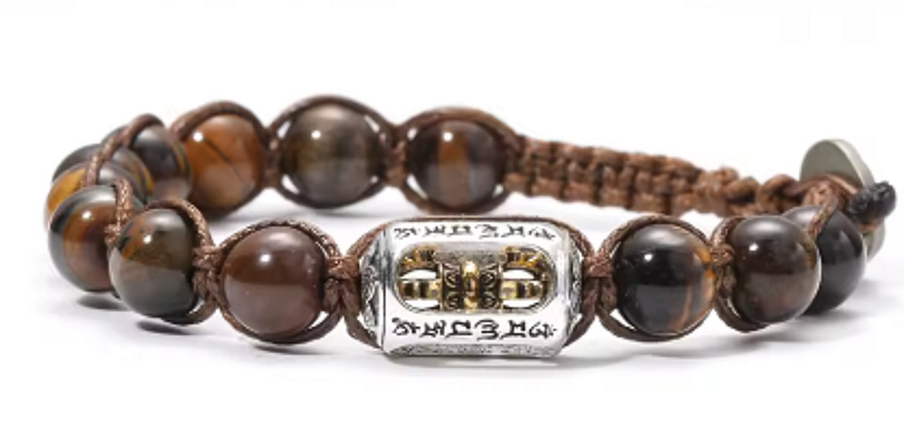 „Výrazný náramek z tygřího oka s tibetským válečkem 9 × 17 mm pro jistotu, vnitřní stabilitu a ochranu na každý den.“