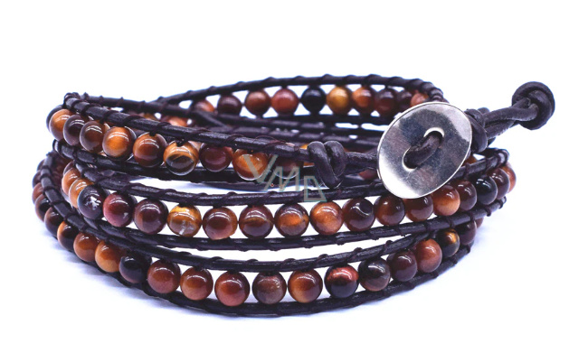 Tygří oko kožený hnědý náramek přírodní kámen zavinovací ručně pletený kulička 6 mm / cca 34 cm + 5 cm, kámen slunce a země, přináší štěstí a bohatství