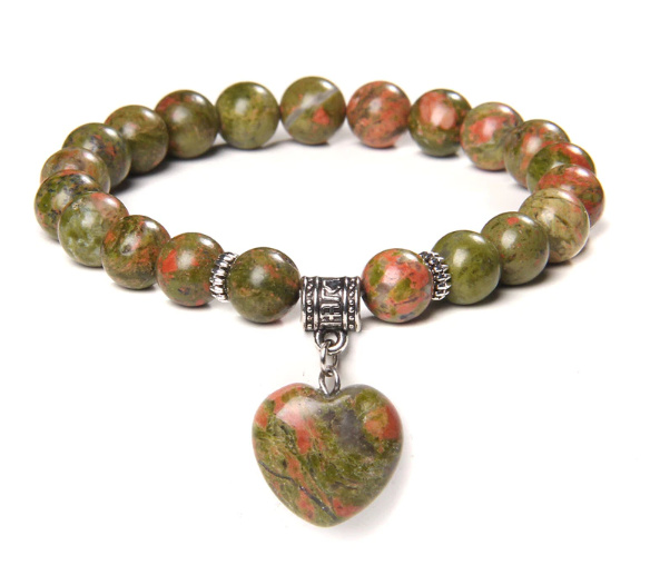 Unakit + Srdce náramek elastický přírodní kámen, kulička 8 mm / 19 cm, kámen osobního růstu a vizí