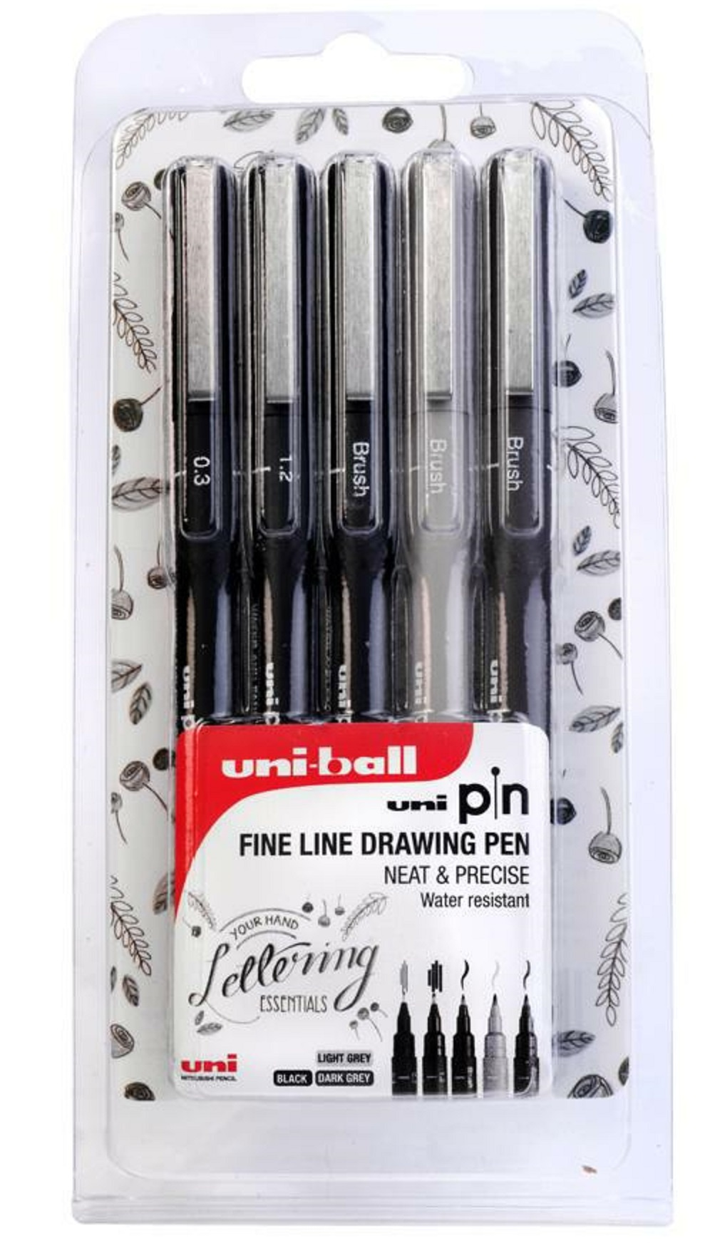 Uni-Ball Uni Pin, kreslící pero speciálně vybraná pro ozdobné písmo a zápis. Každé pero obsahuje voděodolný inkoust odolný proti blednutí.