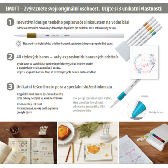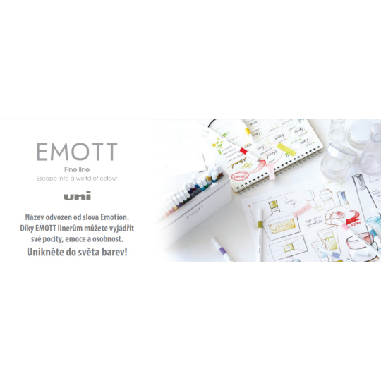 Samotný název EMOTT je odvozen ze slova EMOTIONAL, což také naznačuje, že je to skvělý liner pro vyjádření pocitů. Je ideální na vytváření poznámek ve stylových barvách, které vyjadřují naše emoce. Je to exkluzivní, čistý liner s tloušťkou hrotu 0,4 mm. Přesto, že má jehlový hrot, při používání se nezlomí, protože je vybaven vnějším ochranným obalem. Díky hrotu je psaní tímto perem extra lehké. Neprosákne přes papír, proto je vhodný i na psaní nebo dekorování. Vyrobeno v Japonsku.