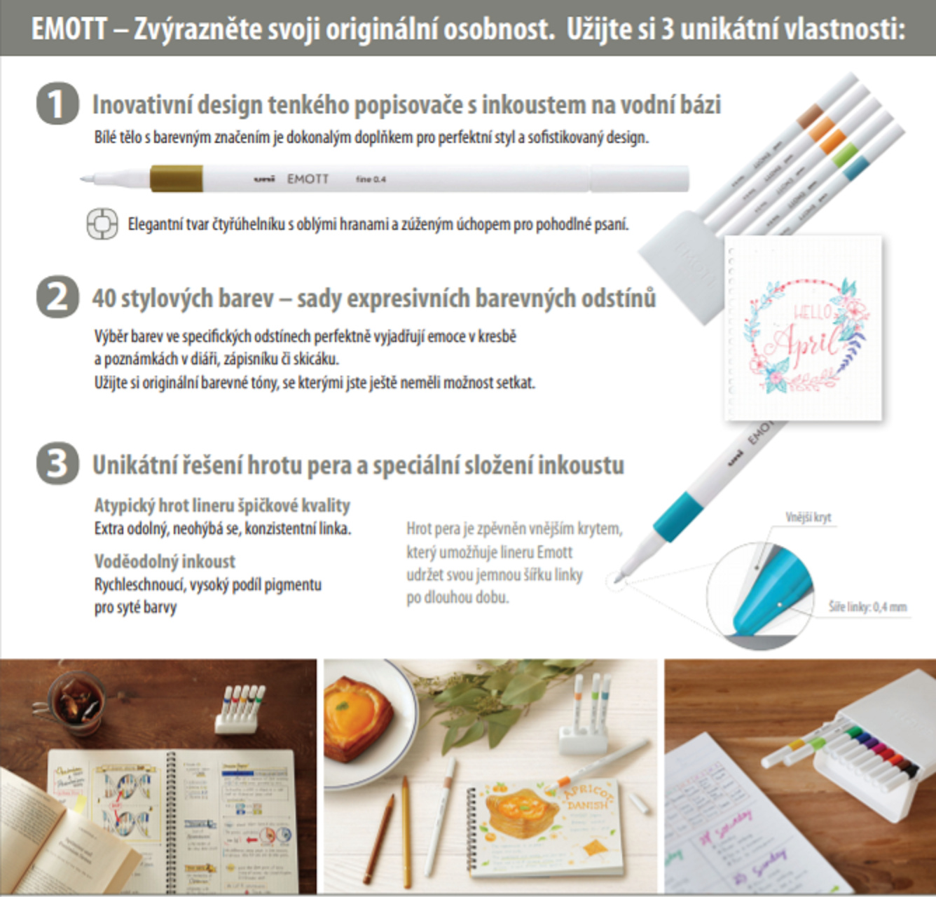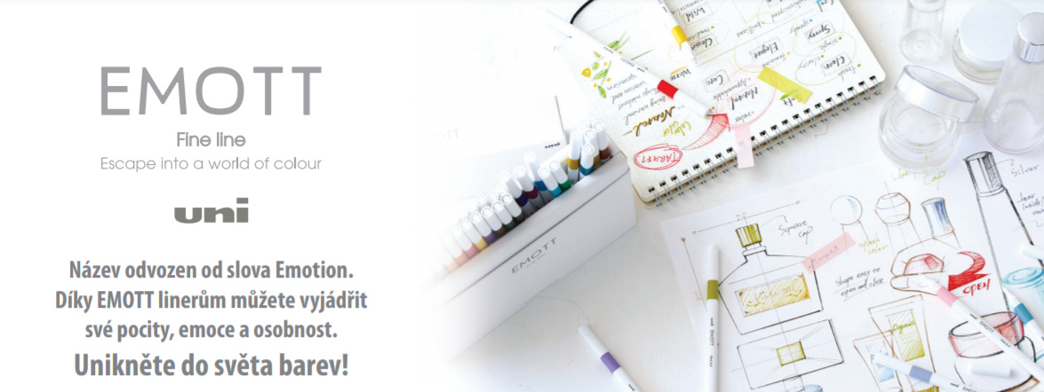 Samotný název EMOTT je odvozen ze slova EMOTIONAL, což také naznačuje, že je to skvělý liner pro vyjádření pocitů. Je ideální na vytváření poznámek ve stylových barvách, které vyjadřují naše emoce. Je to exkluzivní, čistý liner s tloušťkou hrotu 0,4 mm. Přesto, že má jehlový hrot, při používání se nezlomí, protože je vybaven vnějším ochranným obalem. Díky hrotu je psaní tímto perem extra lehké. Neprosákne přes papír, proto je vhodný i na psaní nebo dekorování. Vyrobeno v Japonsku.