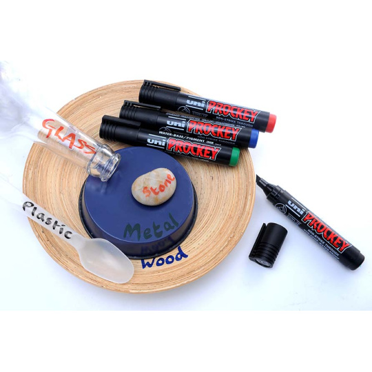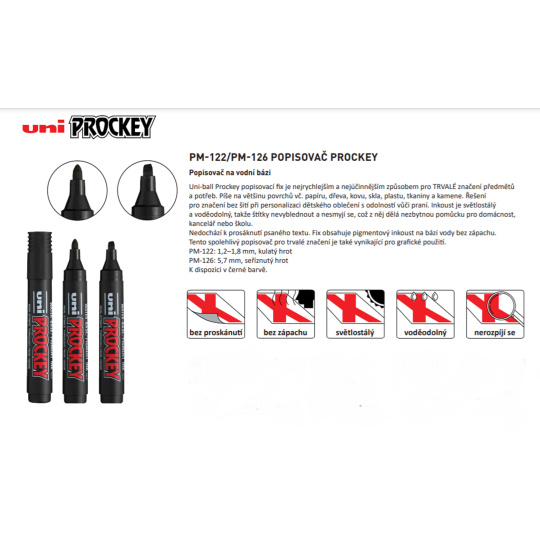 Popisovač na vodní bázi s kulatým hrotem 1,2 - 1,8 mm. Uni-ball Prockey popisovací fix je nejrychlejším a nejúčinnějším způsobem pro TRVALÉ značení předmětů a potřeb. Píše na většinu povrchů vč. papíru, dřeva, kovu, skla, plastu, tkaniny a kamene. Řešení pro značení bez šití při personalizaci dětského oblečení s odolností vůči praní. Inkoust je světlostálý a voděodolný, takže štítky nevyblednout a nesmyjí se, což z něj dělá nezbytnou pomůcku pro domácnost, kancelář nebo školu. Nedochází k prosáknutí psaného textu. Fix obsahuje pigmentový inkoust na bázi vody bez zápachu. Tento spolehlivý popisovač pro trvalé značení je také vynikající pro grafické použití. Vyrobeno v Japonsku.