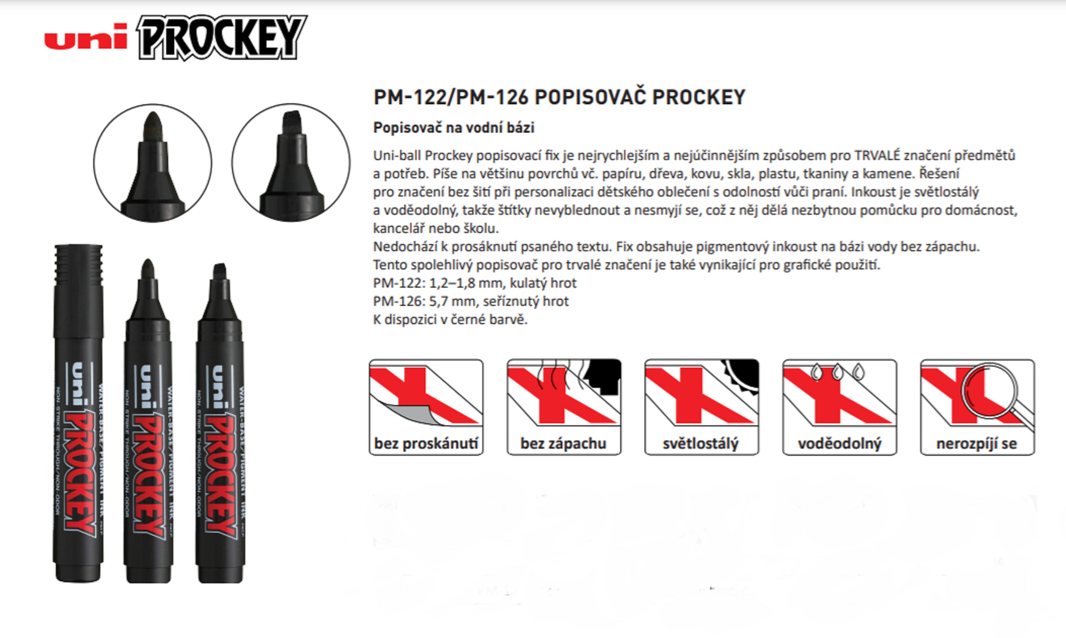 Popisovač na vodní bázi s kulatým hrotem 1,2 - 1,8 mm. Uni-ball Prockey popisovací fix je nejrychlejším a nejúčinnějším způsobem pro TRVALÉ značení předmětů a potřeb. Píše na většinu povrchů vč. papíru, dřeva, kovu, skla, plastu, tkaniny a kamene. Řešení pro značení bez šití při personalizaci dětského oblečení s odolností vůči praní. Inkoust je světlostálý a voděodolný, takže štítky nevyblednout a nesmyjí se, což z něj dělá nezbytnou pomůcku pro domácnost, kancelář nebo školu. Nedochází k prosáknutí psaného textu. Fix obsahuje pigmentový inkoust na bázi vody bez zápachu. Tento spolehlivý popisovač pro trvalé značení je také vynikající pro grafické použití. Vyrobeno v Japonsku.