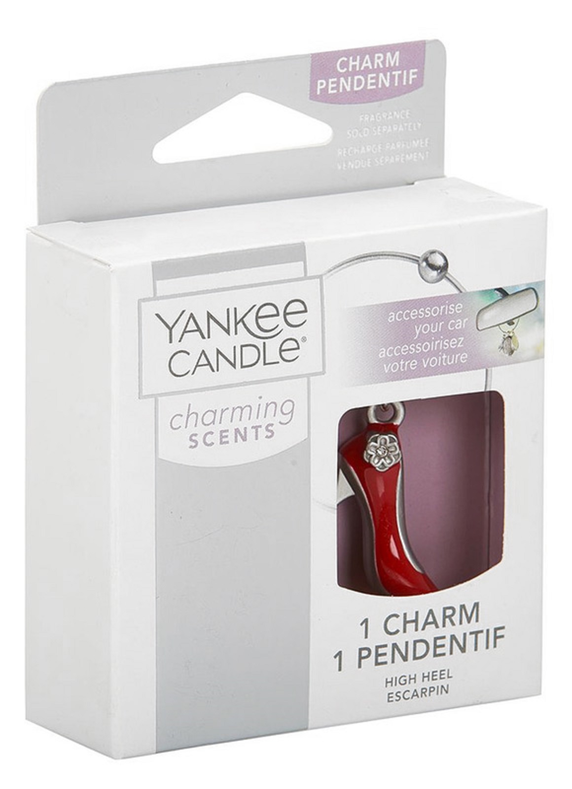 Kovový přívěsek ve tvaru červeného střevíčku na visačku do auta Charming Scents od Yankee Candle.
