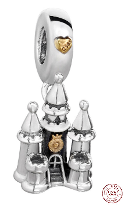Hravý korálek vyrobený ze sterlingového stříbra, ve tvaru královského zámku, pozlacené části jsou ze směsi kovů, pozlacené zlatem, zdobený čirým kamínkem kubické zirkonie, který dodává přívěsku oslnivý třpyt,