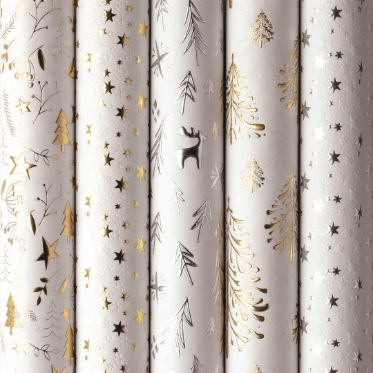 Designově ojedinělý vánoční papír, který odpovídá modernímu trendu balení dárků. Velmi kvalitní, mimořádně pevný a odolný papír. Podklad v bílé barvě, ražba stříbrnou metalizovanou fólií, která vytváří plastický povrch s kovově lesklým efektem. Celá kompozice působí výjimečně a jako malé umělecké dílo.