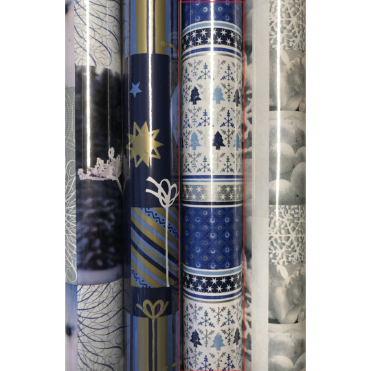 Zoewie Dárkový balicí papír 70 x 150 cm Vánoční Pruhy bílo, modré se stromky